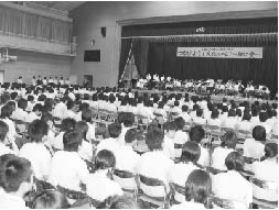 開会行事では、今年より1年生各クラスの合唱の発表がありました。その後、体育館では吹奏楽部の発表、さらに軽音楽の発表。そして、のど自慢大会が行われました。