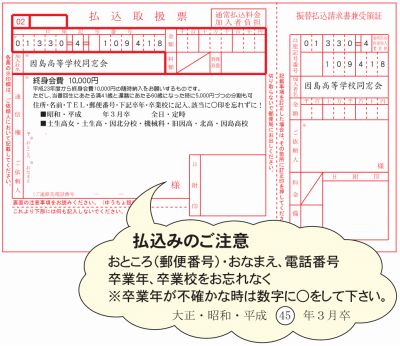 今後、事務局として、同窓会の充実活性化のため諸行事を積み重ねていくつもりです。是非皆様方のご理解とご協力をいただきまして、終身会費の振込みをお願いいたします。振込み用紙は、事務局及び因島高校に用意しています。
