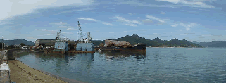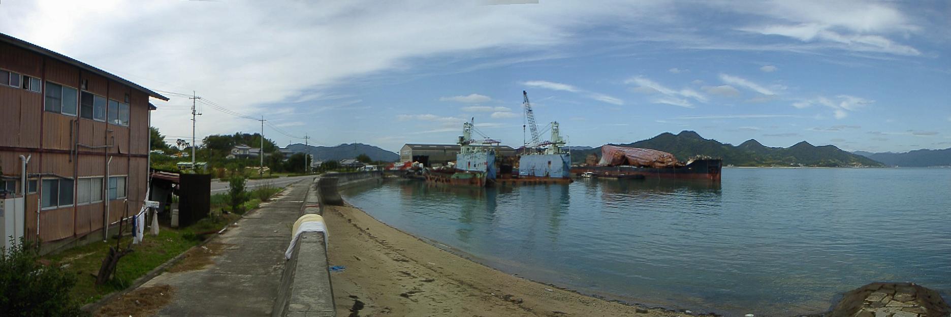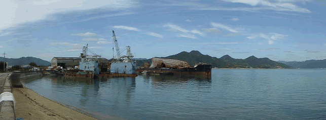 よく晴れた日の瀬戸田の船解体工場。瀬戸内の海と空の