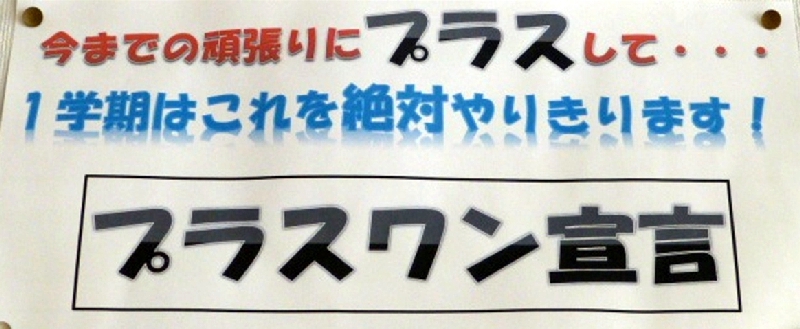 また、この日までに「今までの頑張りにプラスして…1学期はこれを絶対やりきります!」という各自のプラスワンを決め、全員のプラスワン宣言を各学級に掲示しました。一部を紹介します。