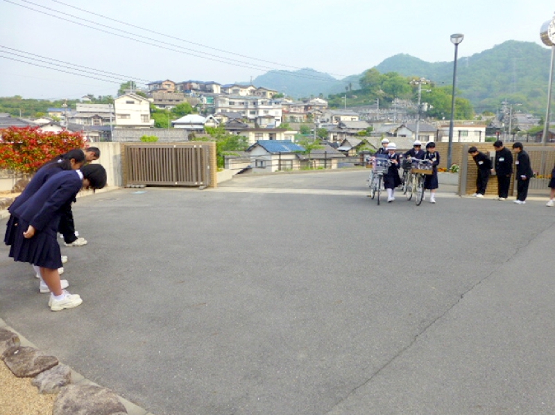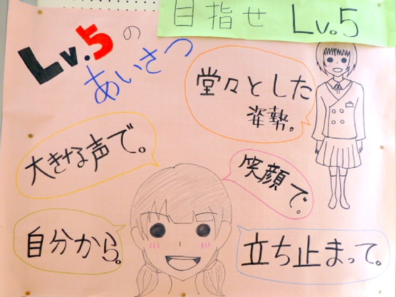 一方、日頃の生活の場面では下を向いて挨拶の声が出ない場面も見られます。生徒会執行部ではその課題を捉え、因島南中学校の生徒全員が、人と人がつながるための挨拶が校内や地域の中でできるようになったらという思いで自分たちからレベル5の挨拶を行い、伝えたいという思いで挨拶運動を行っています。挨拶をしたいと思っていてもどのようにしたらよいか知らなければ、そして、身についていなければできません。日頃から、自分から、相手を見て、相手に伝わる大きな声で、笑顔で挨拶をしたいものです。