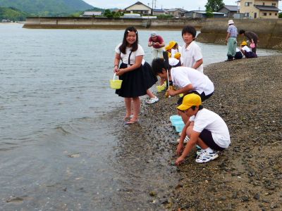 東生口小は洲江桟橋に、2・5・6年25人が集合し1000匹のヒラメ稚魚を放流した。5日に水産教室を、土生小と同じ内容で因島の漁業を学習した。この稚魚は、県水産海洋技術センターで孵化したものを向島町干汐中間育成場で育てた生後85日目のものである。体重0.5グラム、身長8センチのもの。1年後には体長20センチになるという。県や漁協は、栽培漁業とバックフィッシュ運動(獲った小さい魚を海に戻そう)の推進、海のゴミをなくすことを語りかけた。