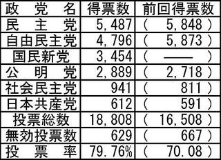 - 争点を「郵政民営化の賛否」に単純化しようという小泉流マジックに翻弄され埋没した民主党だが比例得票は前回を僅か361減の5487票で党派別ではトップ。旧民社王国の組織は根強いものが残っている。