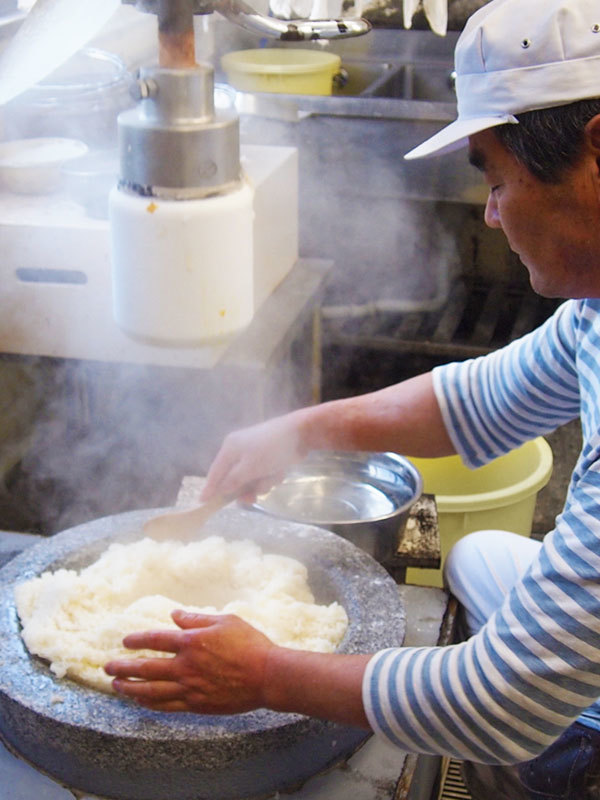 蒸しあがった餅米とみかんの皮を一緒にして、石臼でついて「みかん餅」をつくります。