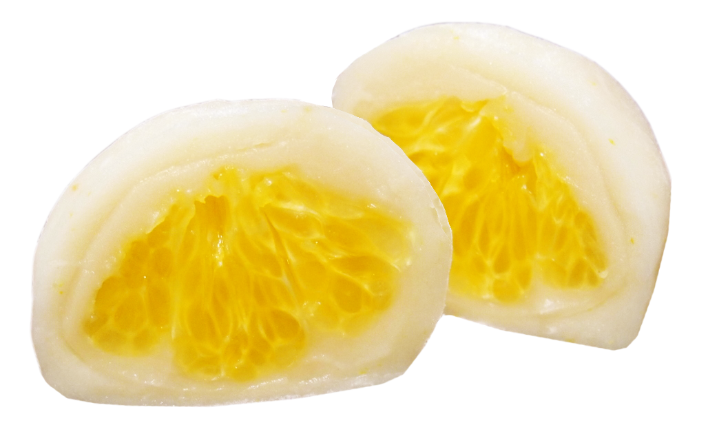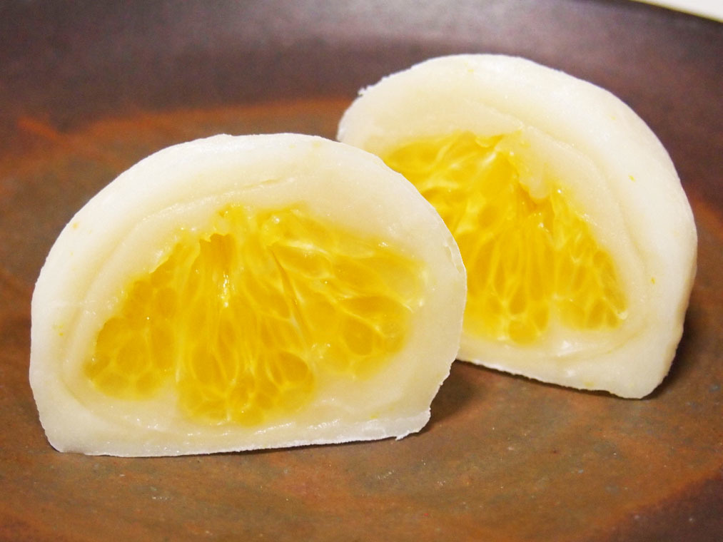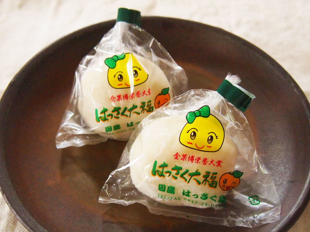 因島発祥の八朔の実を白餡とみかん餅で包んだ大福です。