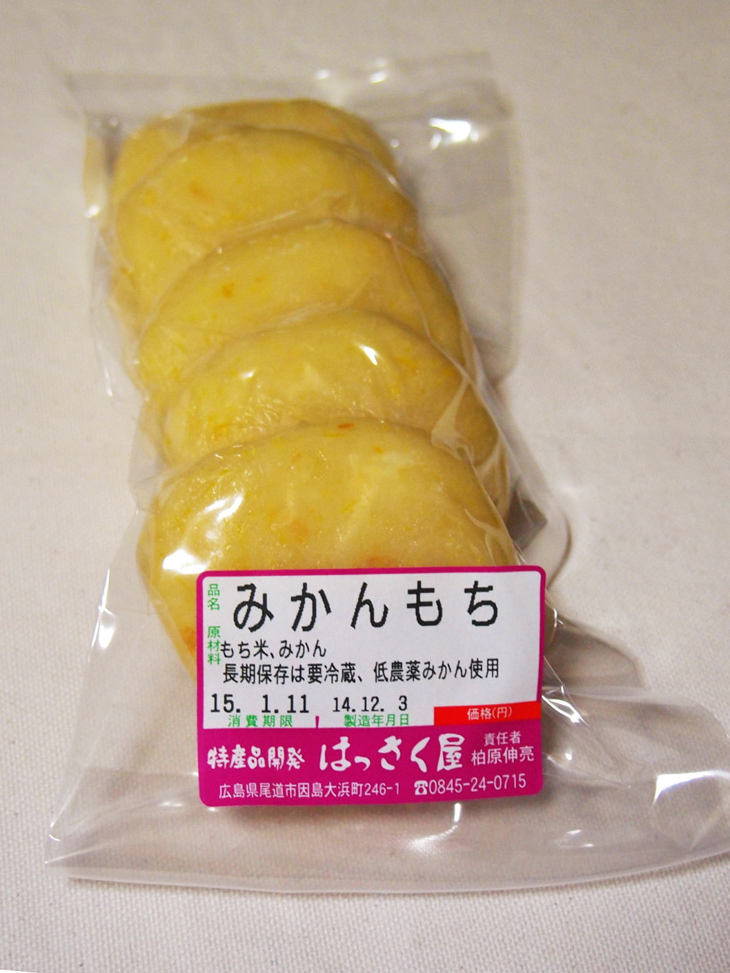 みかん餅 ,likebtn,,{"twitter":true,"facebook":true,"mixi":false,"google":true,"mixikey":"","hatena":false,"pocket":false,"linkedin":false,"line":false,"tumblr":false,"pinterest":false,"facebookCom":false,"sortItems":["twitter","facebook","google"]} みかんと餅米を一緒につきました。みかんの風味がします。鍋に入れて食べるのもオススメです。低農薬みかんを使用しています。●1袋5個入り 価格 400円(税込み) 原材料 餅米、みかん 消費期限 包装袋にて記載※真空にして販売。長期保存は要冷蔵。 みかん餅について 商品一覧はっさく大福はっさく甘夏大福まるごとみかん大福豆だらけ大福ジャンボいちご大福ぶどう甘夏大福丸餅やんだ餅みかん餅伯方の塩なまこ