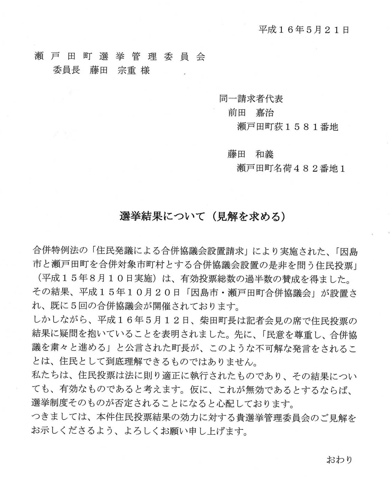 合併を考える会の意見広告に虚偽があるとか、住民投票の結果に疑義があるなどの意見を、自分勝手な意見が出ていましたが、選管からの正式な回答を求め、その回答を公表いたします。