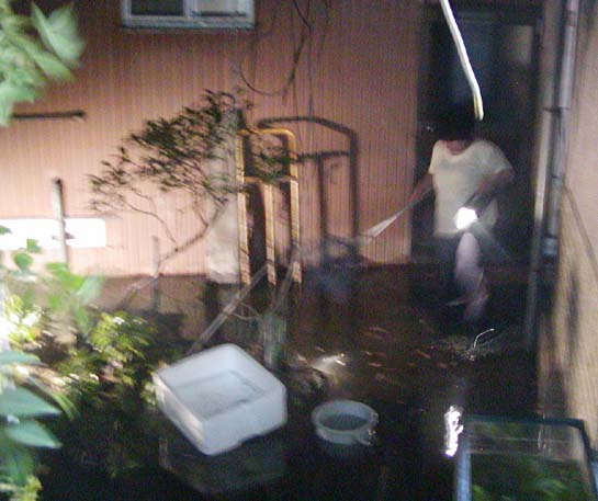裏の池も水没して、いたるところを、金魚やコイが泳いでいました。