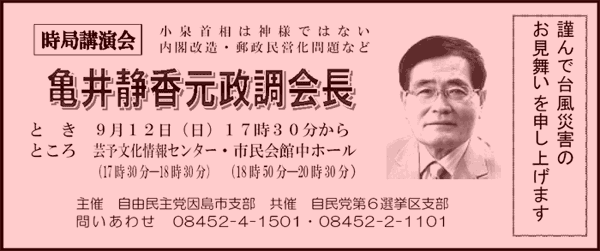 自民党因島市支部(松浦幸男支部長)は12日午後5時30分から芸予文化情報センターで自民党志帥会亀井派の亀井静香会長を講師に招き研修会を開く。