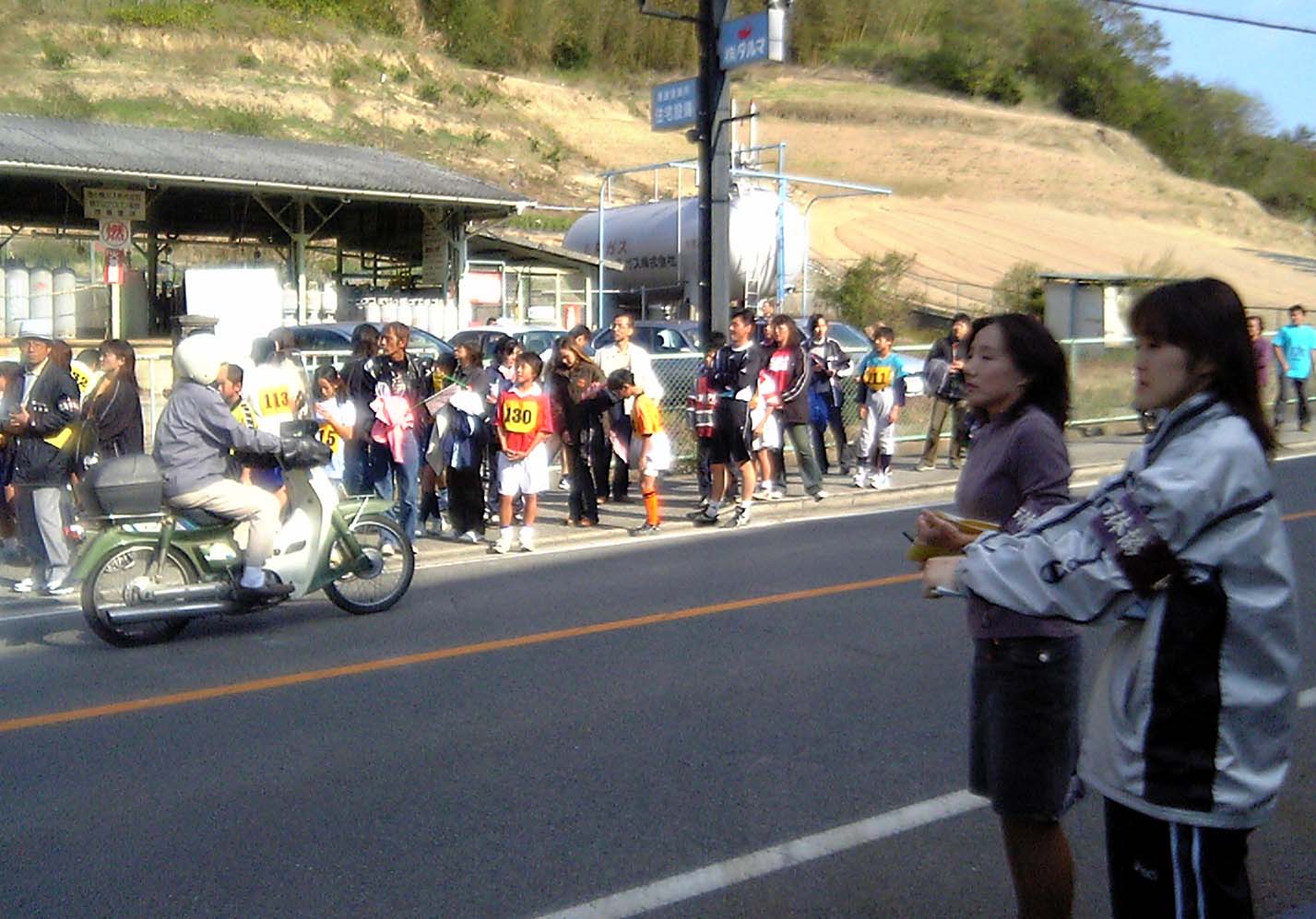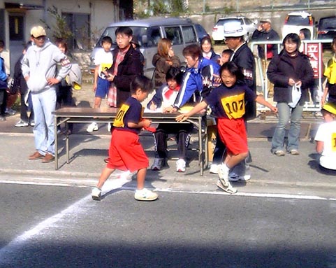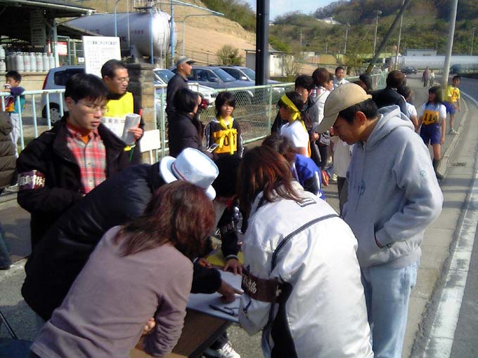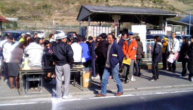 駅伝第1中継所 2004/11/29 by 村上 光 0 駅伝の運営サポートに、各種競技団体が支援のために参加していますが、第1中継所は、ヨット連盟も、お手伝いを行いました。 海上の試合と異なり、陸の上の競技のお手伝いも、慣れてきました。なんといってもも波で揺れないだけ、運営が楽です。 選手が団子になって、中継所に来ることがあるので、両側から、中継の順位をチェックします。 中継の選手がいないこともありますが、今年は問題なく運営できました。タスキを落とさないように、リレーしてください。それでは、頑張って!