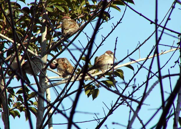 (池の横の、因島市の木のクロガネモチや、金木犀の梢に群がる雀)