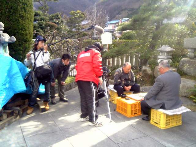 本因坊秀策碑の前で囲碁をしているという設定で、外浦町有志の方に出演をお願いしました。