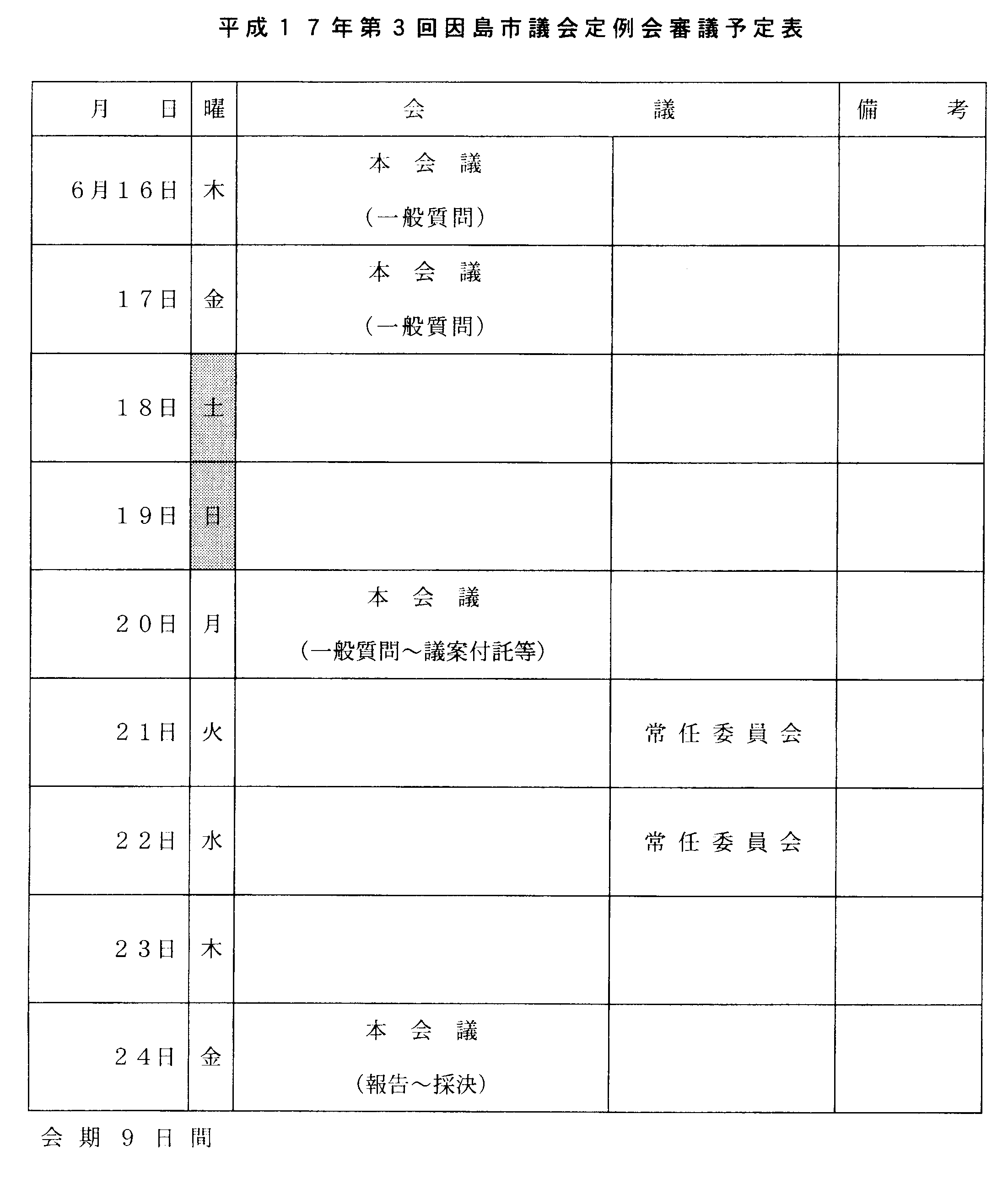 平成17年6月16日午前10時から、第3回定例議会が開催される予定です。
