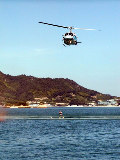 遊びとともに、海上保安庁の海難救助の訓練を見学しました。