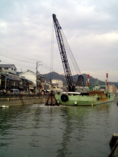 港いっぱいの浚渫船が、大きな爪を持ったシャベルで海底にたまった泥を取っていました。
