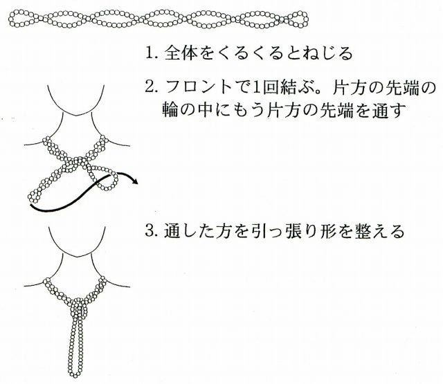 2.フロントで1回結び、片方の先端の輪の中庄町にもう片方の先端を通します。