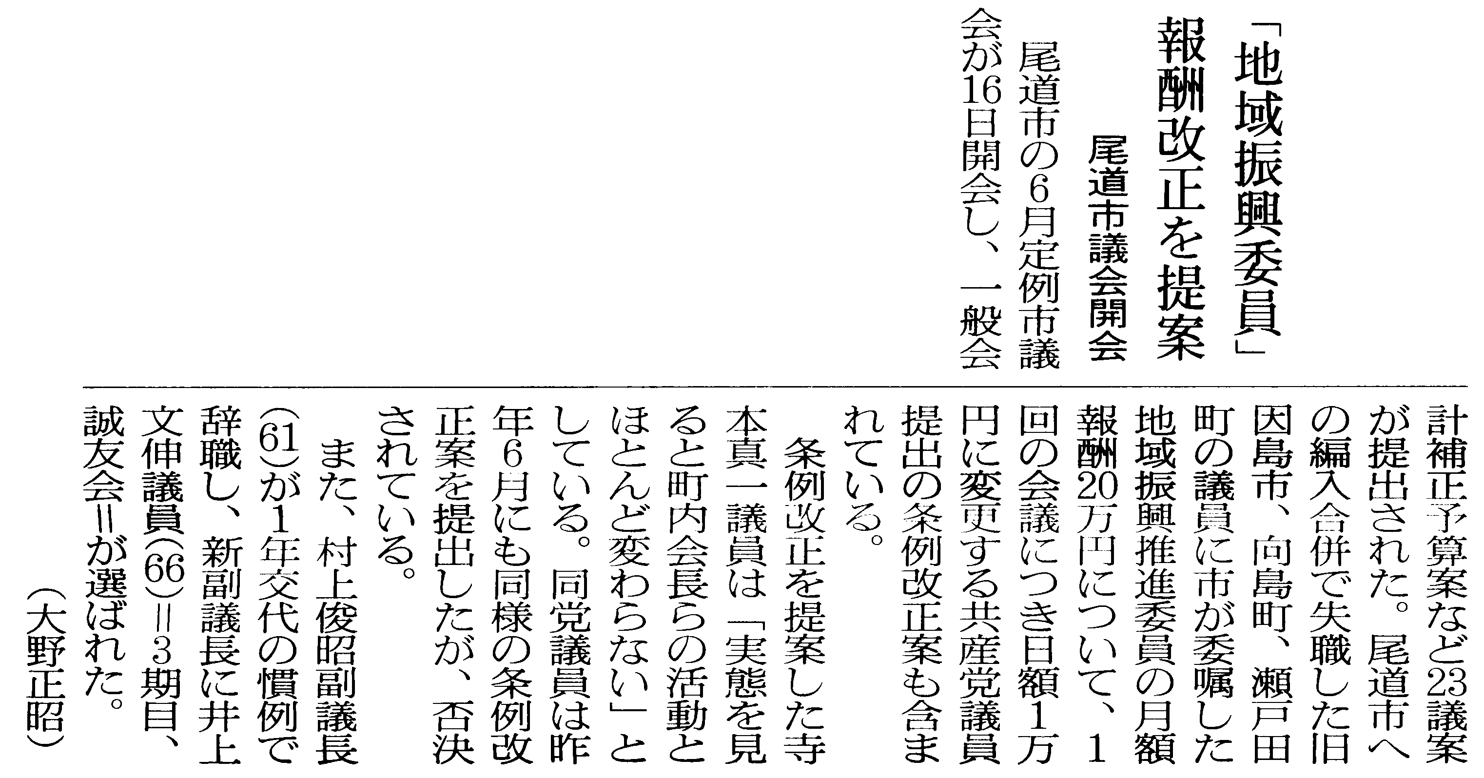 平成18年6月17日の朝日新聞備後版32ページに、尾道市の共産党議員の議会での発言が載っていました。