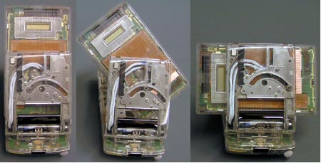 「サイクロイド型携帯の中をのぞくと、2つの軌道があるのが分かる。1つはディスプレイの回転を誘導する軌道で、もう1つはディスプレイ部と本体をつなぐ細線同軸ケーブルの移動をサポートする軌道だ。」