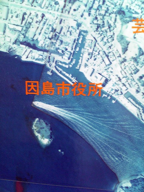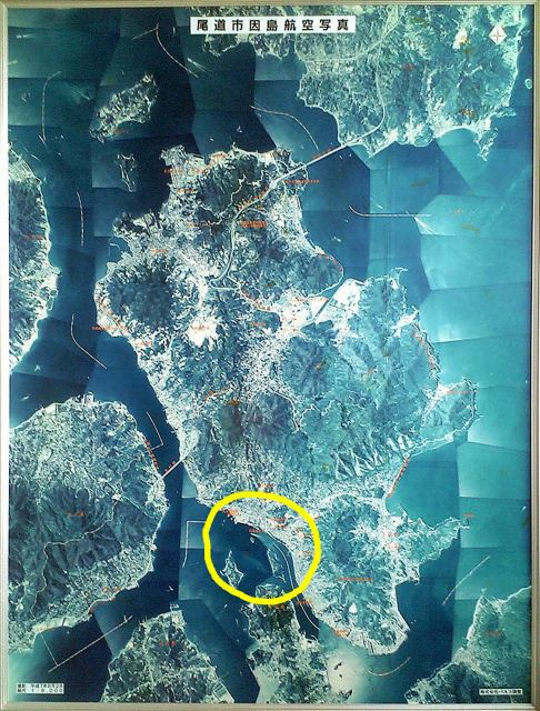 芸予文化情報センター多目的ホールの壁面に、因島の航空写真がありますが、その中に、「因島市」の文字を見つけました。(黄色の円内)