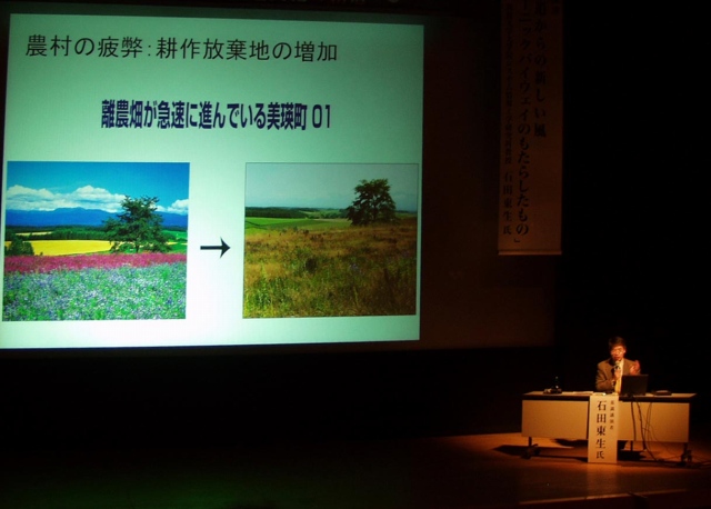 基調講演として、筑波大学の石田 東生(はるお)教授による「シーニックバイウエイのもたらしたもの」と題して、北海道の事例を中心に基調講演が行われました。