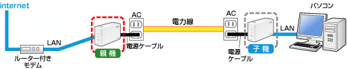 屋内配線の電力線、LANのように使って、インターネットなどが出来る、機械です。