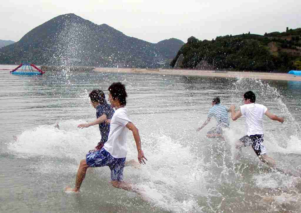 それでも元気な、水着を忘れた、水泳部の、飛沫を上げる、激しい初泳ぎで、サンセットビーチの夏は、始まりました。