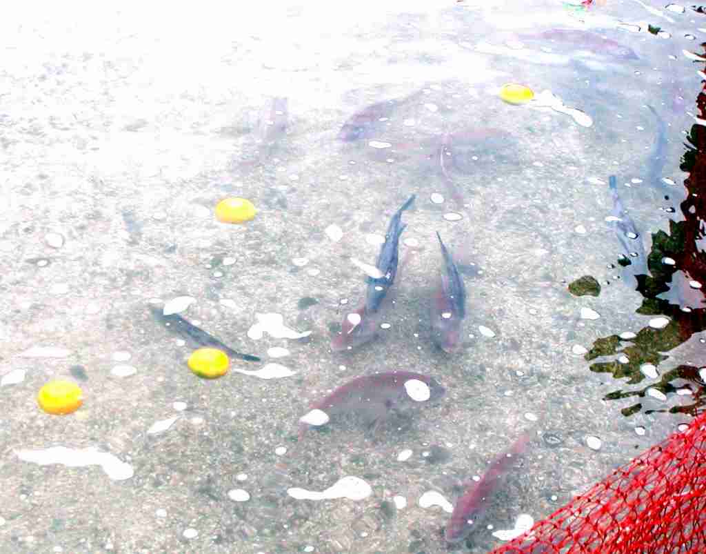 水面の反射で見えずらいのですが、魚は、例年端に集まっています。