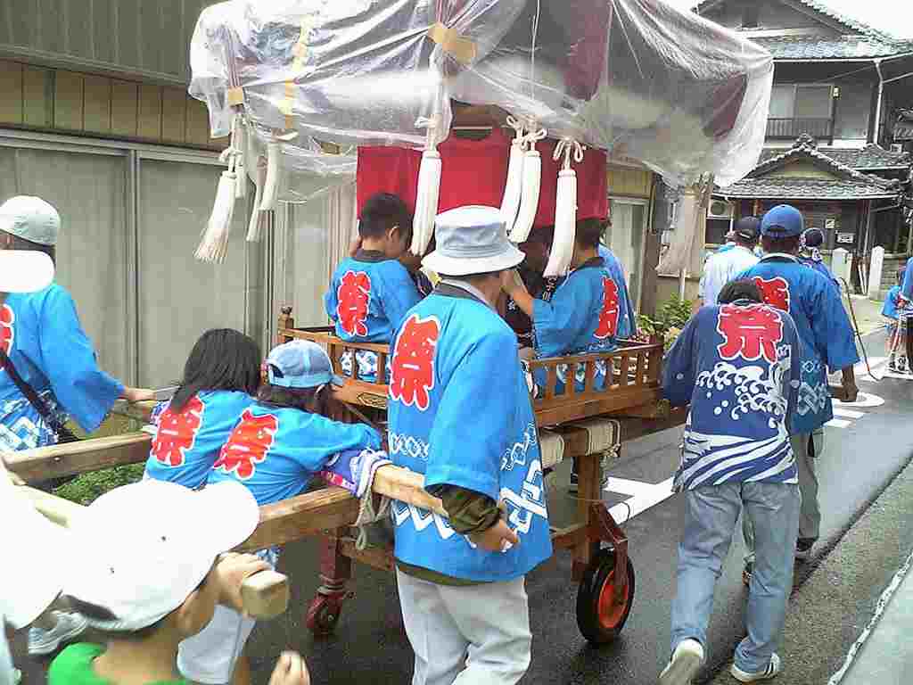 7月7日土曜日、中庄町の公民館前の道で、山王祭のダンジリと出会いました。