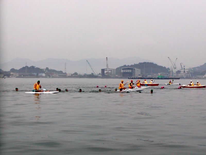 動力船が近づくと危険なため、ボードに乗って監視したり、ボードの外を手漕ぎボートがサポートします。
