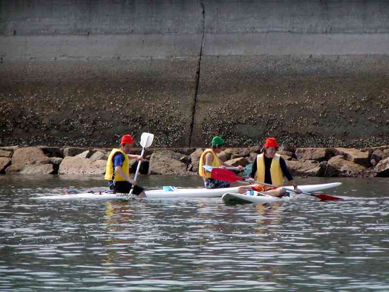 ボードに乗って、カヌーのパドルで漕いで進みます。
