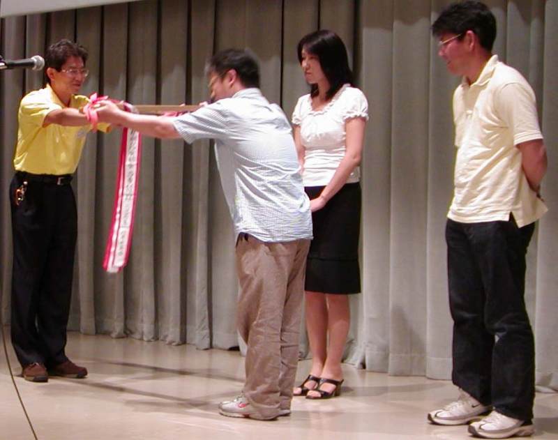 同窓会パートⅡ 2007/08/15 by 村上 光 0 当番回生の皆さん、ごくろうさまでした。生ビール4杯、いただきました。 当番回生を代表して、中山君の挨拶でした。「人集めに・金集め」ご苦労様でした。懇親会のあり方も少し考える時期に来ていますネ。 当番回生の、カギの受け渡し式です。中山君から、かわよし君に…。 「来年は頑張ります。」