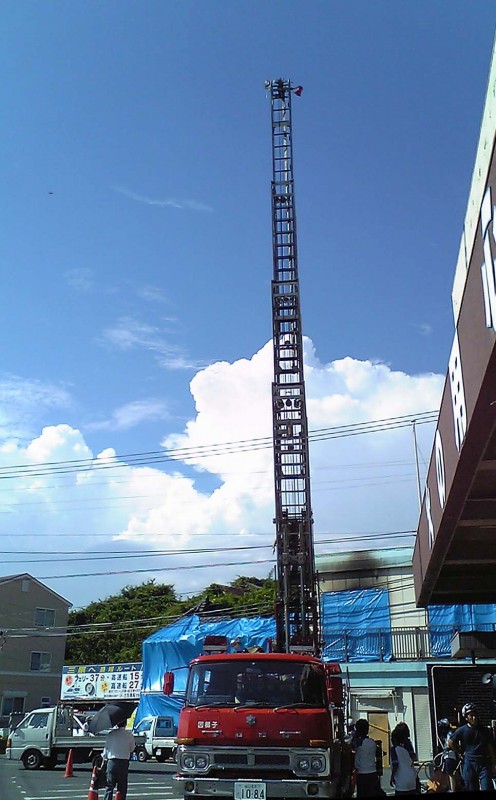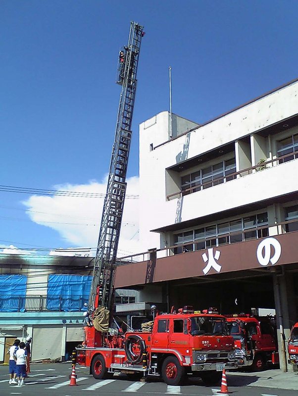 はしご車を全部延ばすと、数十メートルの高さになります。