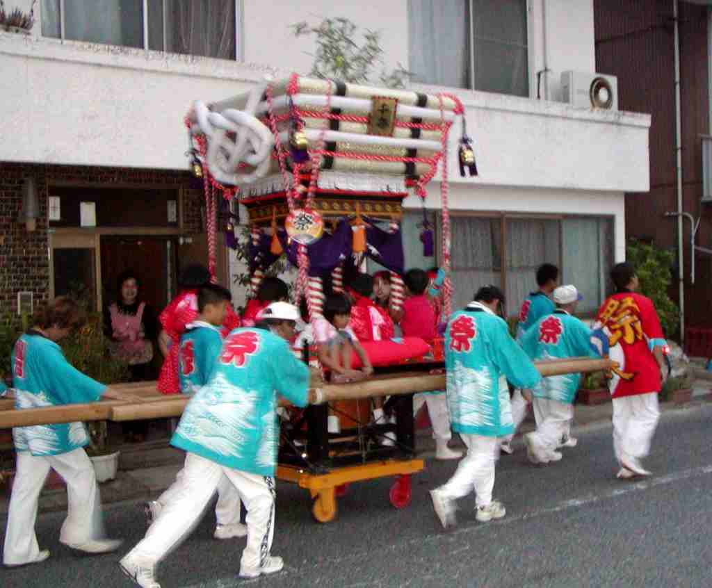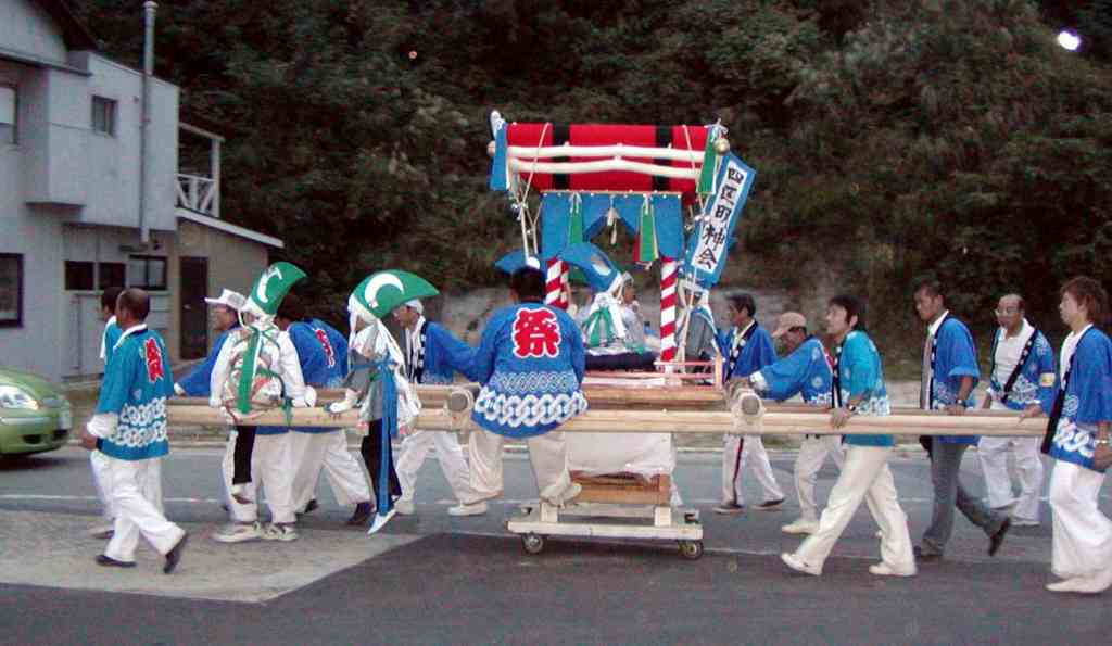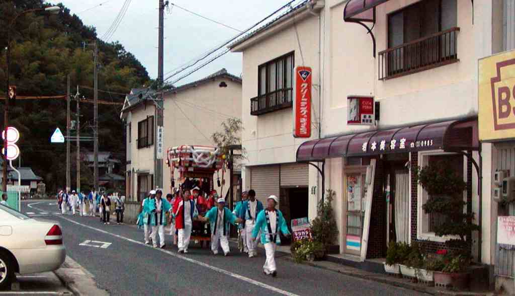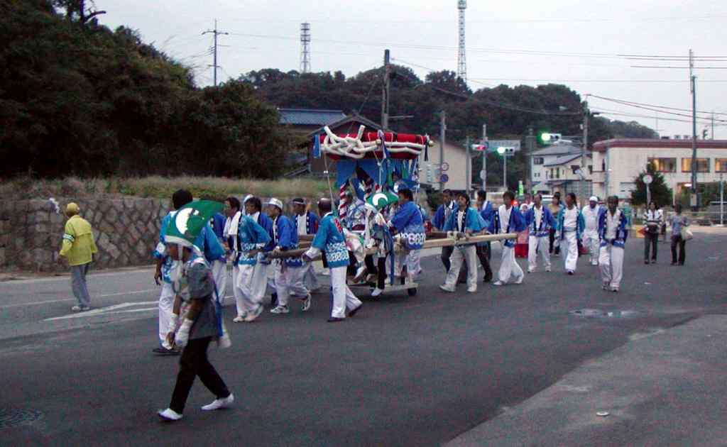 10月7日日曜日、8日のヨットレースの準備を確認しに、三庄町小用港に向かっていると、生協の前で3区千守のダンジリに出会いました。