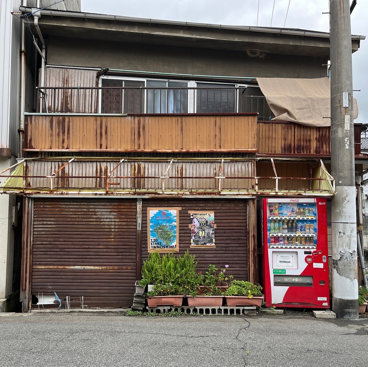 因島土生町「宮地書店」にて。島ごとぽるの展としまなみビーチフェスのポスターがシャッターにガムテで貼ってます。午後から営業のお店です。駄菓子屋さんでもあります。#因島 #島ごとぽるの展 #ポルノグラフィティ #因島土生町 #shimanamibeachfes #しまなみビーチフェス
