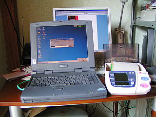 東さんのTOSHIBA DynaBook Satellite 2100をメンテンナンス中に血圧をはかる僕。今朝は147ありました(^^; 寝不足だと高くなるようです。