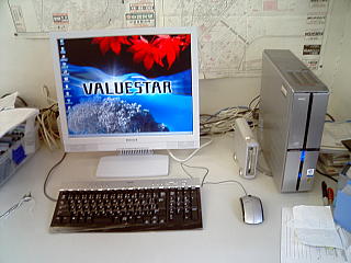 新パソコンはNECダイレクトでカスタム注文したバリュースター(CeleronD2.66GHz、160GHDD、512MRAM、DVDスーパーマルチドライブ)。モニターはIODATAの19インチで44000円でした。やすくなったのう。
