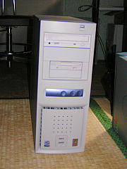 マサノリさんとこで登記業務に使っていたパソコンに無線LANクライアントカード(WLI2-PCI-G54S)を取り付け。背面の黒い棒はアンテナです。