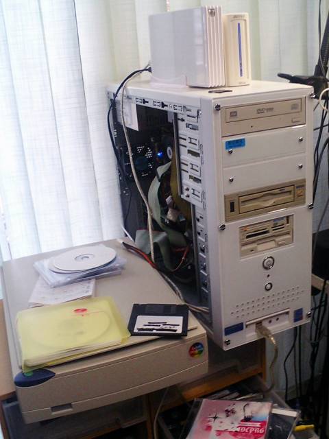 パソコンは組み立てパソコン(ギガバイト製?)でカバーを開けっ放しです。モニターはソニーの15インチ液晶でmixiが画面に表示されてました。(このモニターは以前僕も使っていた機種です。)