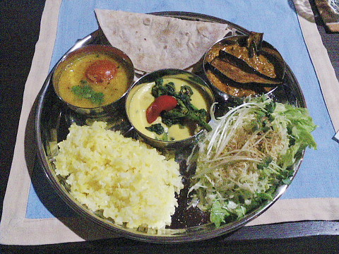 これがモハンアシュラムのカレー!3種類のカレーとチャパティに薄味のカレー飯、コショー味のドレッシングがかかったキャベツ。ボリューム満点で腹いっぱいです(*^^)v