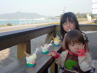 昼に瀬戸田に行ったとき、子供も一緒に連れて行って、帰りにドルチェでアイスクリームを食べました。僕が栗、マリカはみかん、モノリはいちごミルクでした。