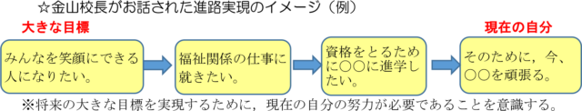 金山校長は、数学の問題を使って勉強における「気づく」ことの大切さを教えてくださり、また、みなさんに期待することとして、将来の夢や目標のために今をどう頑張るかについてお話をしていただきました。