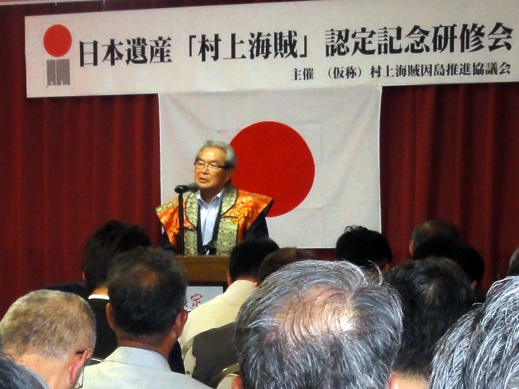 村上水軍のロマンが日本遺産に認定されたことを記念して3日、ホテルいんのしまで研修会が行なわれ、104人が参加した。