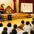 手作りの紙芝居「洋服に火がついたらどうする?~とまって、たおれて、ころがろう~」と「もりのしょうぼうだん」を実演。
