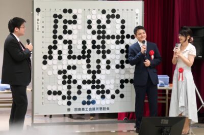 - 秀策杯決勝戦対局直後の様子。中央が優勝した辻五段。左が村本四段。右が大盤解説・大会総審判長の吉田美香八段(関西棋院)