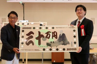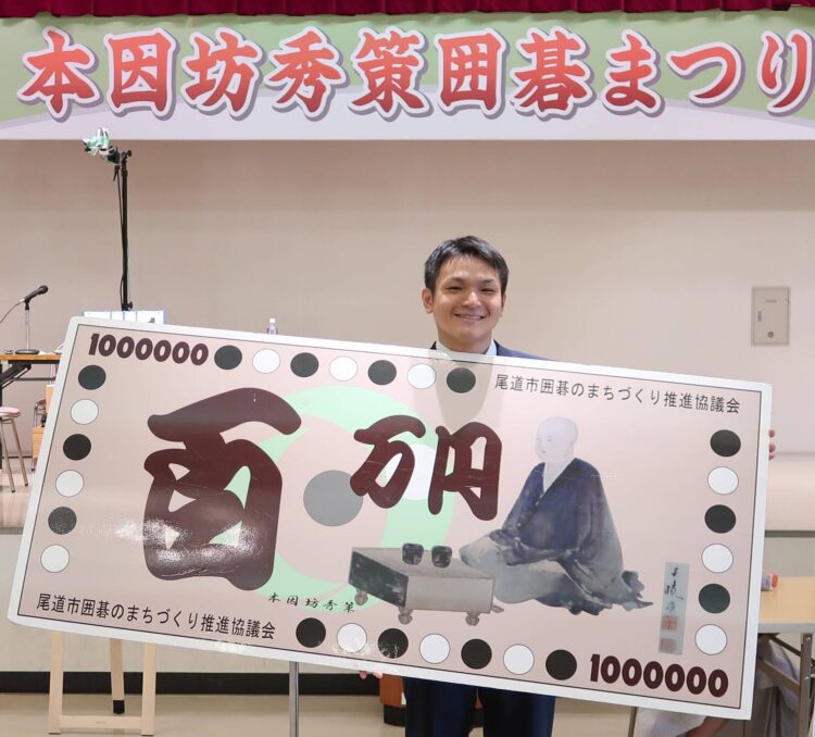 プロ棋士・アマ棋士各8人で争う本因坊秀策杯の決勝戦は2時間の対局で接戦を繰り広げ、関西棋院の辻篤仁五段が、日本棋院の村本渉四段を「1目半」で退け優勝、賞金100万円が手にした=写真㊤。優勝した辻五段は「金メダルが取れて良かったです」と開催中のパリ五輪にかけて喜びを語り会場を沸かせた。