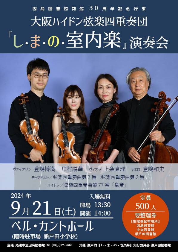 尾道市立因島図書館(TEL 0845-22-8660)は11月3日に開館30周年を迎える。記念して9月21日(土)、大阪ハイドン弦楽四重奏団による「し・ま・の・室内楽」演奏会を瀬戸田ベル・カントホールで開催する。