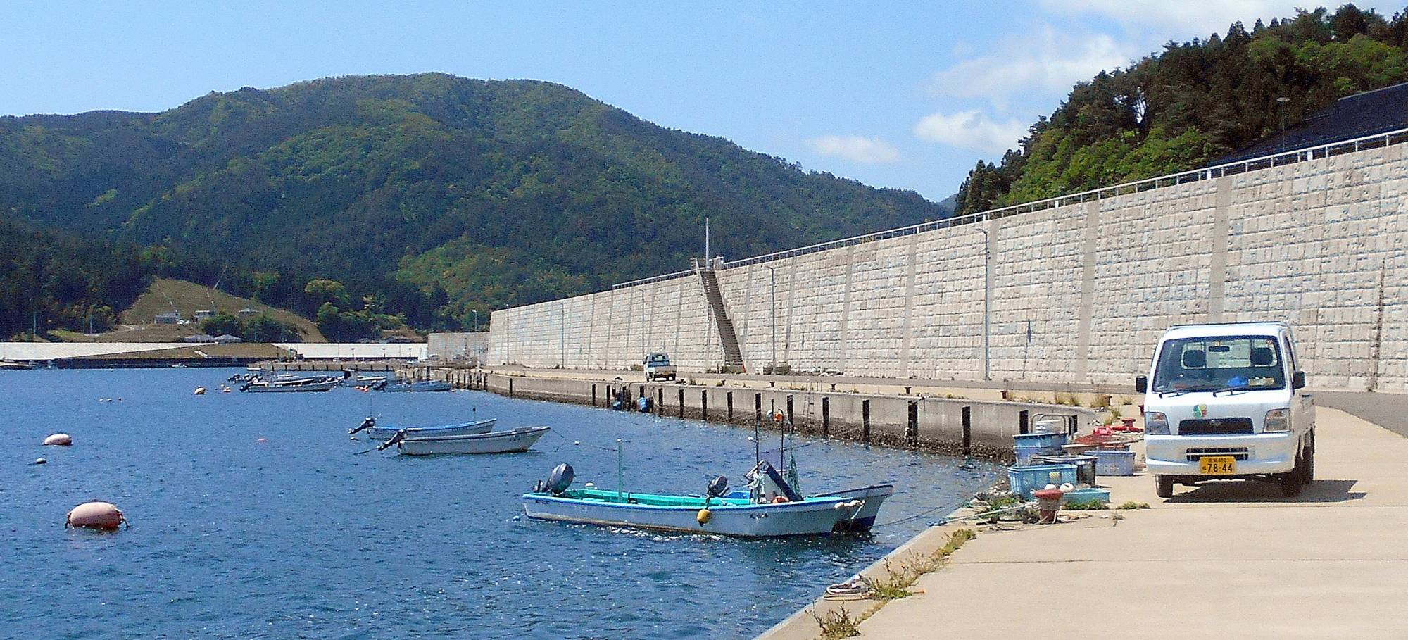 私は屋外に出て雄勝湾(宮城県石巻市雄勝町)を見下ろしながら歩く、湾内には養殖棚や刺し網のブイがたくさん浮いている。