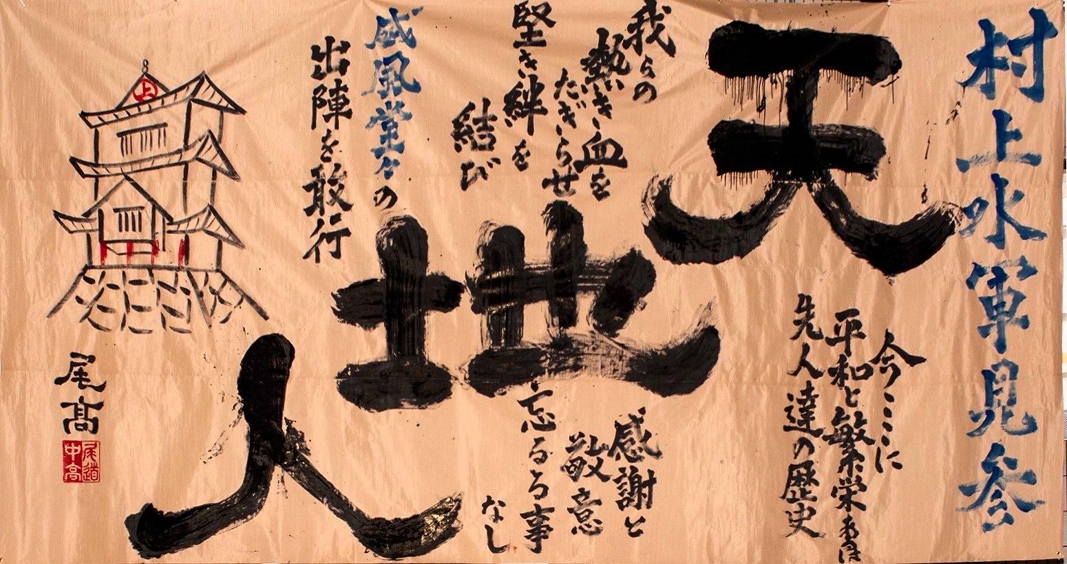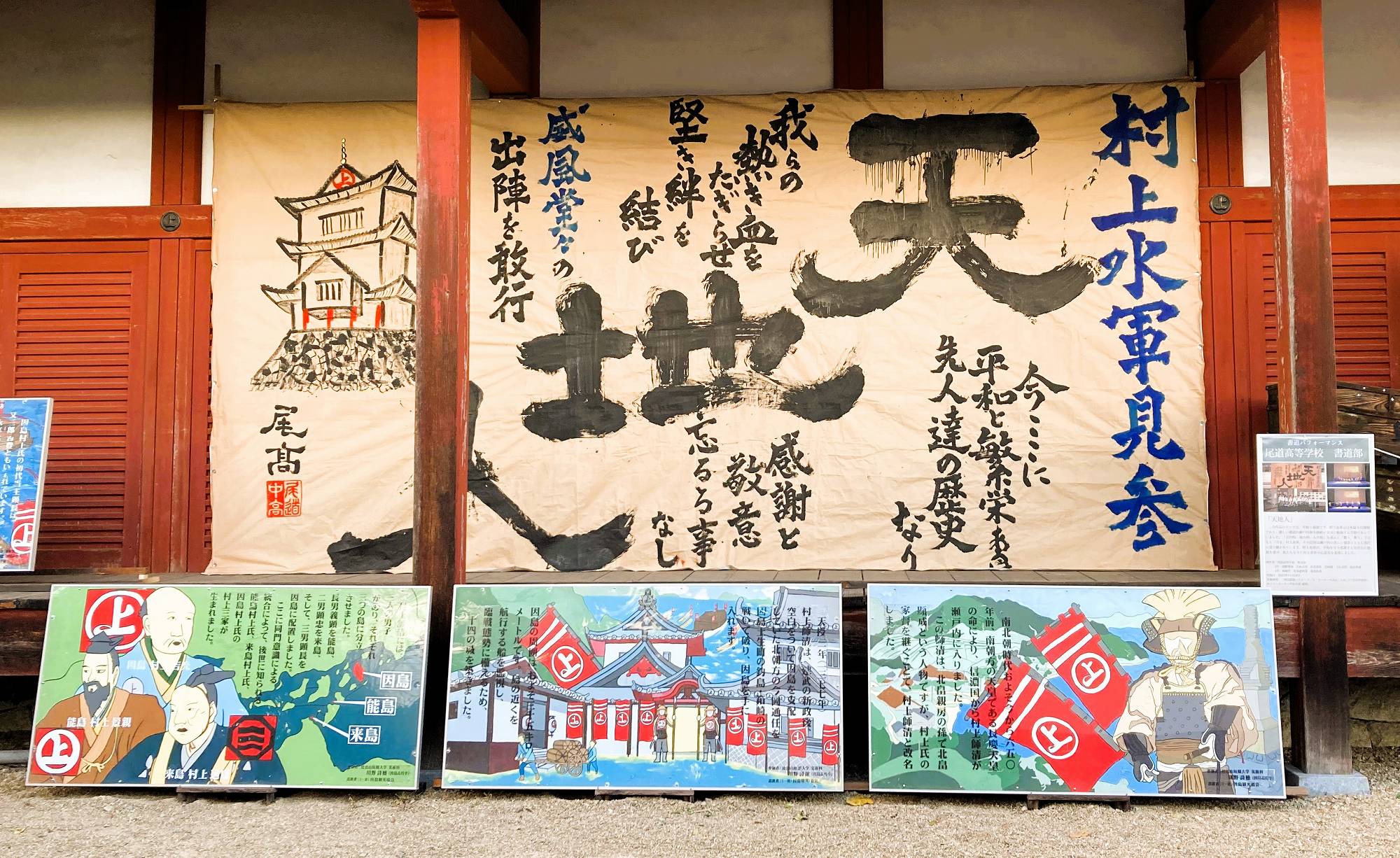尾道市因島中庄町の因島水軍城資料館の縁側にて、尾道高等学校書道部の生徒9人が制作した縦3メートル、横6メートルの大作(ベージュ色の布製)が展示されている。
