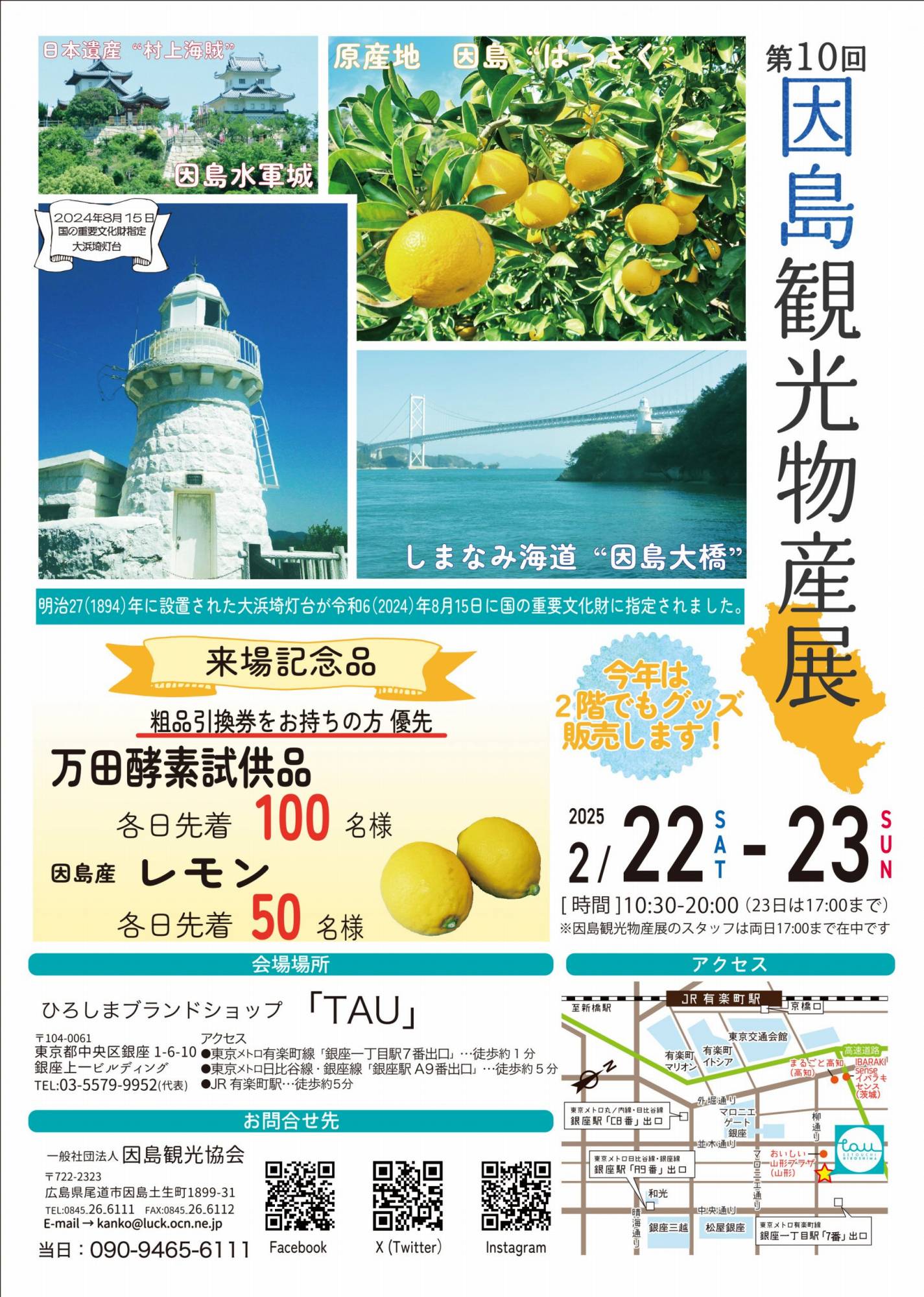 第10回因島観光物産展が2月22日(土)・23日(日)、東京銀座にある広島ブランドショップTAU(☎03-5579-9952)で開催される。主催は一般社団法人因島観光協会(村上祐司会長)。