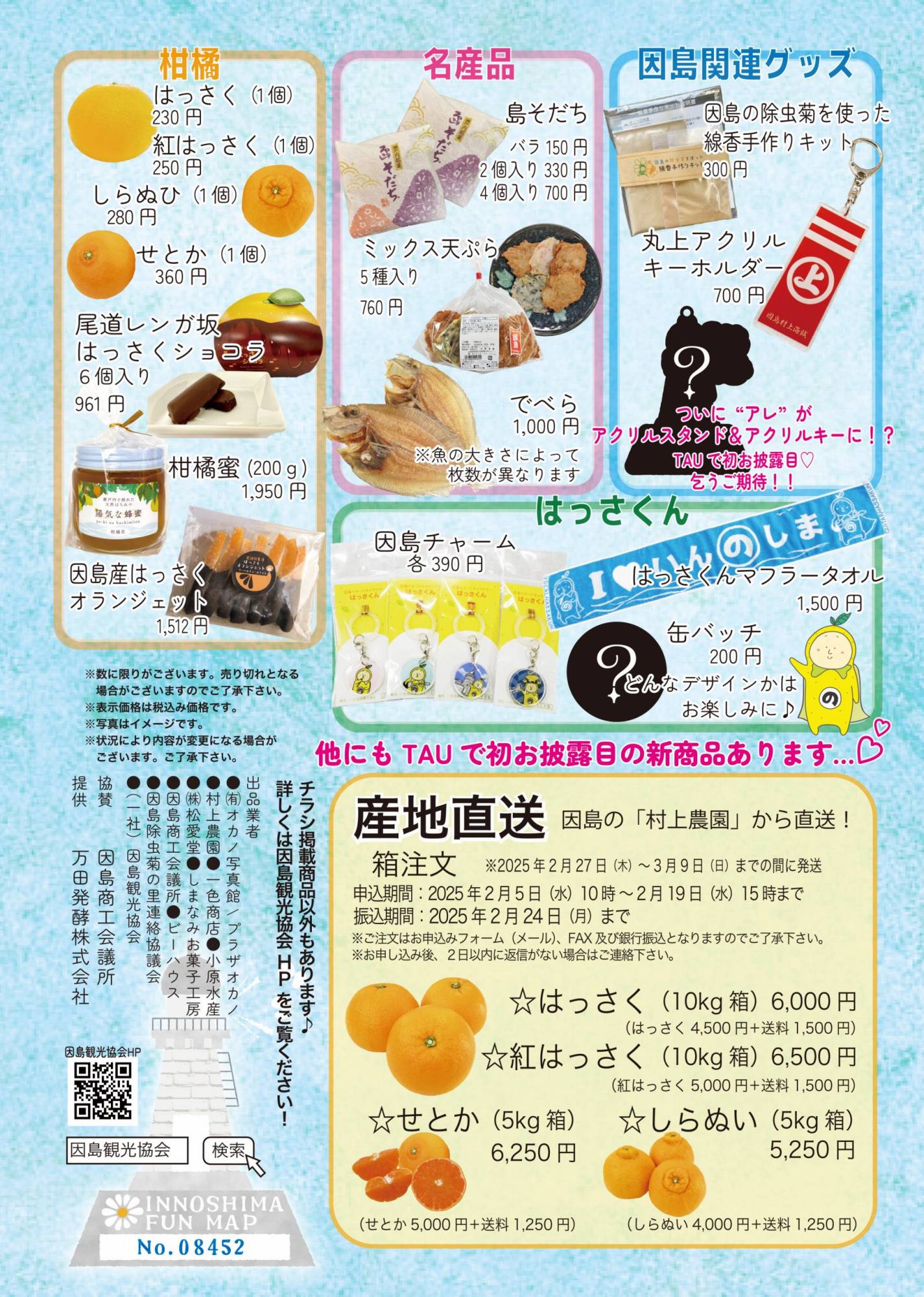 島そだち▽ミックス天ぷら▽でべら▽柑橘蜜▽因島産はっさくオランジェット▽尾道レンガ坂はっさくショコラ▽柑橘類各種▽因島関連グッズ販売(除虫菊線香手作りキット、丸上アクリルキーホルダー、因島チャーム、はっさくんマフラータオル、缶バッチなど)。